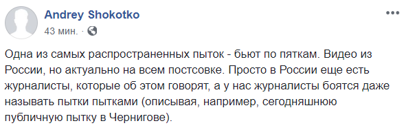 Блогер Андрей Шокотко сравнивает происходящее в Чернигове с пыткой заключенного в российской колонии. "Просто в России еще есть журналисты, которые об этом говорят, а у нас журналисты боятся даже называть пытки пытками", - говорит он.