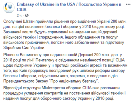 "Соединенные Штаты приняли решение о выделении Украине $200 млн на цели усиления безопасности и обороны в 2018 бюджетном году. Указанные средства будут направлены на предоставление нашей стране военной техники и снаряжения, другого оборудования и услуг военного назначения, логистического обеспечения и подготовку Вооруженных сил Украины", – говорится в сообщении на странице посольства в Facebook в пятницу вечером.