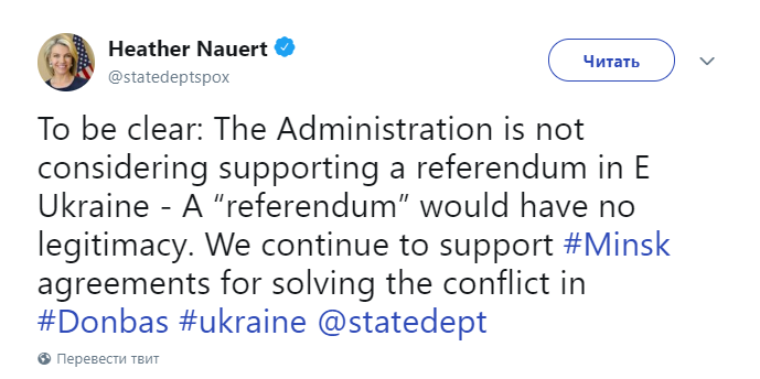 Представитель Государственного департамента Соединенных Штатов Хизер Нойерт подтвердила в пятницу информацию о том, что в администрации США не рассматривают вопрос о поддержке возможного проведения референдума о независимости на востоке Украины, который Путин предложил Трампу.
