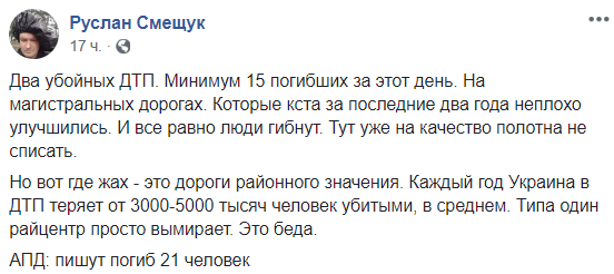"Два убойных ДТП. Минимум 15 погибших за этот день. На магистральных дорогах. Которые кста за последние два года неплохо улучшились. И все равно люди гибнут. Тут уже на качество полотна не списать.