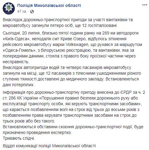 В пятницу, 20 июля, около 5:00 на трассе "Киев-Одесса" неподалеку от поселка Кривое Озеро произошло ДТП. Погибли пятеро человек, еще 12 госпитализированы. Все погибшие оказались гражданами Беларуси.