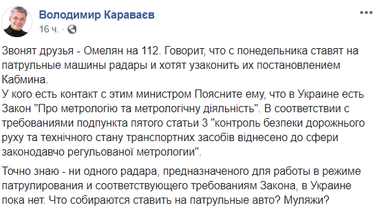 Точно знаю - ни одного радара, предназначеного для работы в режиме патрулирования и соответствующего требованиям Закона, в Украине пока нет. Что собираются ставить на патрульные авто? Муляжи?", - интересуется эксперт по безопасности дорожного движения Владимир Караваев.