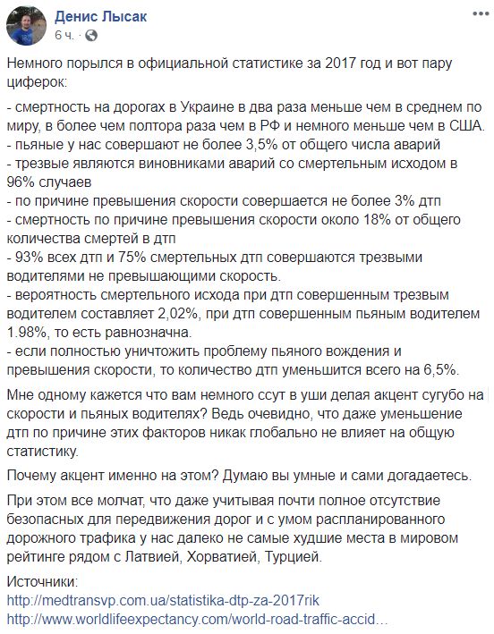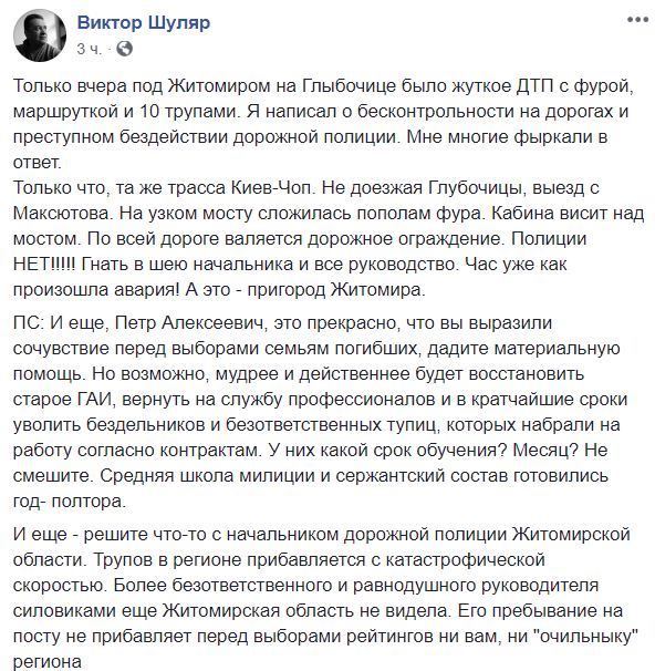 "Только вчера под Житомиром на Глыбочице было жуткое ДТП с фурой, маршруткой и 10 трупами. Я написал о бесконтрольности на дорогах и преступном бездействии дорожной полиции. Мне многие фыркали в ответ.