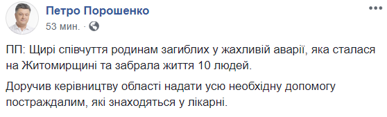 "Искренние соболезнования семьям погибших в ужасной аварии, которая произошла на Житомирщине и унесла жизни 10 человек.