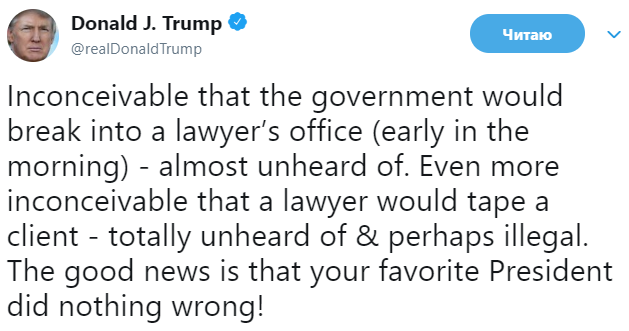 "Немыслимо, что власти врываются в кабинет адвоката (рано с утра), почти неслыханно. Еще более немыслимо то, что адвокат записывает слова клиента, вообще неслыханно и, возможно, незаконно. Хорошая новость в том, что ваш любимый президент не делал ничего плохого", - написал Трамп в Twitter.