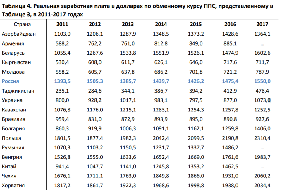Согласно этой методике, реальная заработная плата в России в прошлом году составила $1550, что на 5% выше уровня 2016 года.