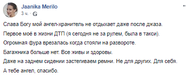 Однако через 15 - 20 минут после инцидента на странице в Facebook и. о. заместителя мэра Яники Мерило был опубликован пост о похожем ДТП, в результате которого она чудом осталась жива.