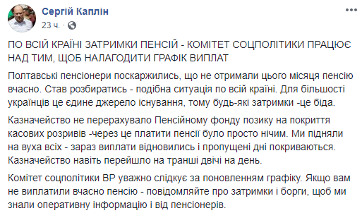 Член комитета Верховной Рады Украины по соцполитике нардеп Сергей Каплин сообщил, что проблема возникла, поскольку казначейство не перечислило пенсионному фонду займ на покрытие кассовых разрывов - то платить пенсии просто нечем. С начала он узнал об этой проблеме в Полтавской области, а потом оказалась, что такая ситуация по всей стране.