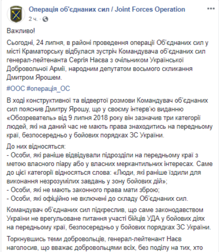 "В ходе беседы обсуждались вопросы участия мотивированных бойцов УДА в составе всех видов и родов Вооруженных сил Украины (в том числе в составе полноценного подразделения) на условиях заключения контракта (в том числе краткосрочного). Было предложено прохождение военной службы в резерве в составе боевых воинских частей специального назначения, разведки и в подразделениях территориальной обороны", - говорится в сообщении на странице операции объединенных сил (ООС) в Фейсбуке.