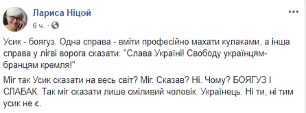 "Усик - трус. Одно дело - уметь профессионально махать кулаками, а другое дело в логове врага сказать: "Слава Украине! Свободу украинцам - пленникам Кремля!"