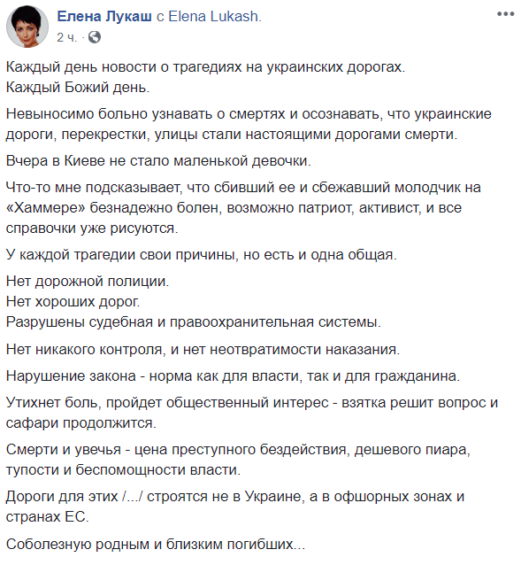 Настигнет ли водителя возмездие? Не уверена. В таких случаях я за другие бумеранги. Ибо справедливого суда в этой стране также не существует", – пишет адвокат Елена Лешенко.