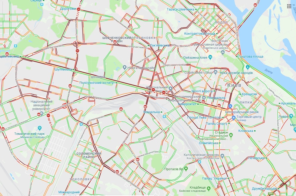 Самые большие пробки наблюдаются в центре Киева, в частности на бульваре Тараса Шевченко, на улице Хрещатик, Большая Васильковская, Басейная, Льва Толстого, Саксаганского, а также на Майдане Независимости, свидетельствуют данные Google Maps.