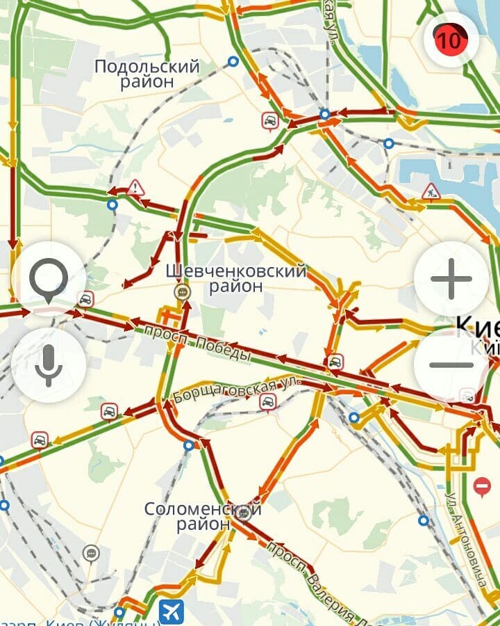 Также пробки зафиксированы на улице Нижний Вал, Борщаговская, Юрковская, Нижнеюрковская, Набережно- Хрещатицкая, Елены Телиги. Пробки наблюдаются на проспекте Победы и на Большой Окружной дороге.