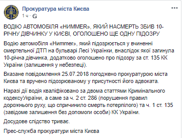 "Водителю автомобиля Hиmmer, который подозревается в совершении смертельного ДТП на бульваре Леси Украинки, в результате которого погибла 10-летняя девочка, дополнительно объявлено о подозрении по ст.135 Уголовного кодекса Украины (оставление в опасности)", - говорится в сообщении.