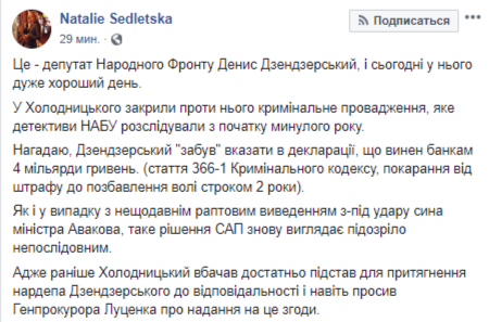 "Как и в случае с недавним внезапным выводом из-под удара сына министра Авакова, такое решение САП снова выглядит подозрительно непоследовательным. Ведь раньше Холодницкий видел достаточно оснований для привлечения нардепа Дзензерского к ответственности и даже просил генпрокурора Луценко на это согласится" - написала она.