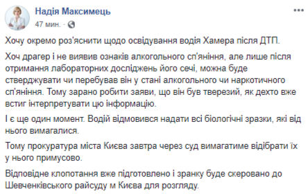"Хочу отдельно разъяснить по освидетельствование водителя Хамера после ДТП. Хотя Драгер и не обнаружил признаков алкогольного опьянения, но только после получения лабораторных исследований его мочи, можно будет утверждать ли он в состоянии алкогольного или наркотического опьянения. Поэтому рано делать заявления, что он был трезв, как кое-кто уже успел интерпретировать эту информацию. И есть еще один момент. Водитель отказался предоставить все биологические образцы, которые от него требовались. Поэтому прокуратура города Киева завтра через суд потребует отобрать их у него принудительно. Соответствующее ходатайство уже подготовлено и утром будет направлено в Шевченковский райсуд г. Киева для рассмотрения", пишет Максимец.
