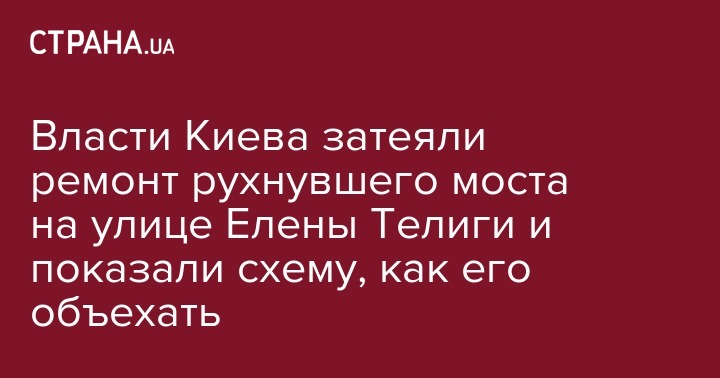 В Киеве после вчерашнего обвала моста на пересечении улиц Кирилловская и Елены Телиги власти закрыли движение на нем, затеяли ремонт и предложили схему временного объезда. Об этом сообщила пресс-служба КГГА.