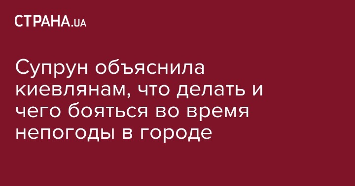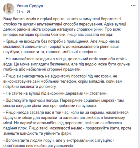"Вижу много мемов в ленте о том, как киевляне вынуждены бороться со стихией и искать альтернативные способы передвижения. Ведь улицы некоторых районов города скорее напоминают настоящие реки. На всякий случай напомню правила безопасности, если вас застала непогода", - написала Супрун.