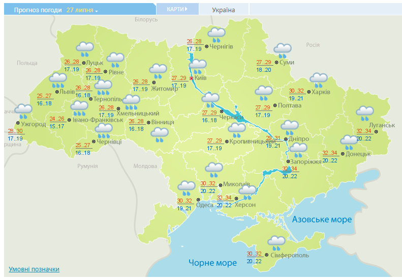 В течение пятницы, 27 июля, в Украине ожидается теплая, но облачная погода с прояснениями. Об этом говорится в сообщении Гидрометцентра.