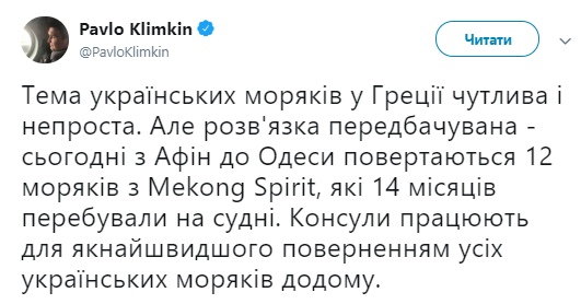 "Тема украинских моряков в Греции чувствительная и непростая. Но развязка предсказуема -сегодня из Афин в Одессу возвращаются 12 моряков с Mekong Spirit, которые 14 месяцев находились на судне", - написал в соцсети министр.