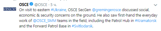 "Во время визита в Восточную Украину генсек ОБСЕ Томас Гремингер обсудил вопросы социальной, экономической и социальной безопасности на местах. Он также видел непосредственно повседневную работу команд СММ ОБСЕ "в полях", в том числе патрульный хаб в Краматорске и базу прямого патрулирования в Светлодарске", - говорится в сообщении в микроблоге ОБСЕ в twitter в пятницу.