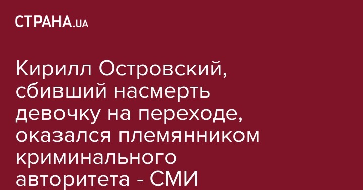 Кирилл Островский, сбивший насмерть девочку на переходе в центре Киева, является родственником судимого криминального авторитета и главаря преступной группировки, которая "работала" с недвижимостью. Об этом пишет Обозреватель, ссылаясь на свои источники.