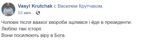 "Человек после тяжелой болезни исцелился и идет в президенты. Люблю такие истории. Они усиливают веру в Бога", - пишет журналист Василий Крутчак.