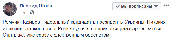 "Ромчик Насиров - идеальный кандидат в президенты Украины. Никаких иллюзий: жалкое г...но. Редкая удача, не придется разочаровываться. Опять же, уже сразу с электронным браслетом", - считает журналист Леонид Швец.