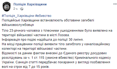 Полицейские Харьковской области устанавливают обстоятельства гибели 23-летнего военнослужащего, тело которого было обнаружено на территории воинской части в городе Лозовая. Об этом сообщается на странице региональной Нацполиции в Facebook.