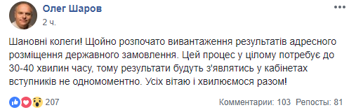 Генеральный директор директората высшего образования и образования взрослы МОН Украины Олег Шаров уточнил в Facebook, что процесс появления результатов рейтинга на бюджет займет 30-40 минут после выгрузки и появится не одномоментно. То есть кто-то из абитуриентов узнает, прошел ли на бюджет раньше, кто-то - позже.