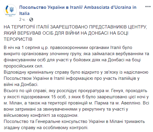 "В ночь на 1 августа полицейские Италии разоблачили организованную преступную группировку, которая занималась вербовкой и финансированием лиц для участия в боевых действиях на Донбассе на стороне пророссийских сил. Соответствующее уголовное дело было открыто в связи с направленной посольством Украины в Италии информацией об участии итальянцев в войне на Донбассе", - говорится в сообщении.