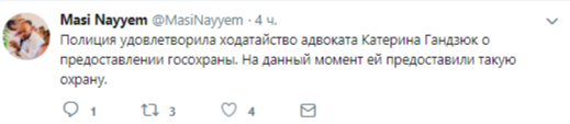 "Полиция удовлетворила ходатайство адвоката Екатерины Гандзюк о предоставлении госохраны. На данный момент ей предоставили такую охрану", - сообщил он в Twitter.