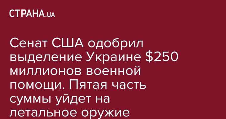 "Сенат США принял ранее проголосованный Палатой представителей проект закона о "Бюджете США на 2019 на нужды национальной обороны", которым санкционировано выделение Министерству обороны США $250 миллионов для предоставления помощи Украине. Из указанной суммы $50 миллионов должно быть направлено на летальные виды вооружений.