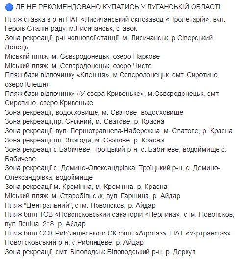 В список нерекомендованных попали пляжи в рекреационных зонах ряда городов Винницкой и Житомирской областей, Чернигова на Десне, а также некоторые пляжи рек Уж, Латорица, Синявка и Иршавка в Закарпатье.