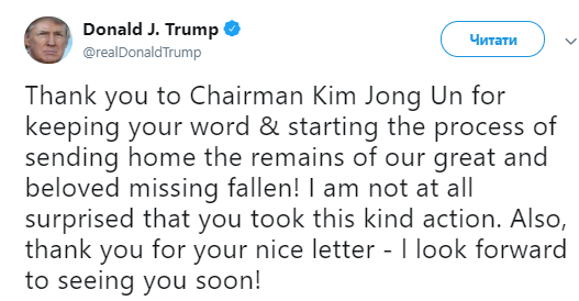 "Спасибо председателю Ким Чен Ыну за то, что вы сдержали слово и начали процесс отправки домой останков наших больших и ожидаемых жертв",- написал глава Белого дома.