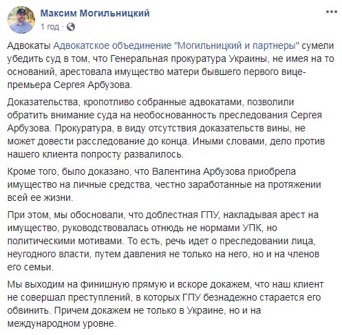 "При этом, мы обосновали, что доблестная ГПУ, накладывая арест на имущество, руководствовалась отнюдь не нормами УПК, но политическими мотивами. То есть, речь идет о преследовании лица, неугодного власти, путем давления не только на него, но и на членов его семьи. Мы выходим на финишную прямую и вскоре докажем, что наш клиент не совершал преступлений, в которых ГПУ безнадежно старается его обвинить. Причем докажем не только в Украине, но и на международном уровне", - резюмировал Могильницкий.