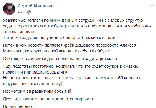 "Уважаемые коллеги, по моим данным, сотрудники из силовых структур ходят по редакциям и требуют размещать информацию, что я якобы кого-то изнасиловал. Такое же задание получили и блогеры, близкие к власти. Источником новости является фейк дешевого порохобота Алексея Минакова, которую он опубликовал у себя в Фейбуке. Считаю, что это очередная попытка дискредитации меня. Жду подставы постоянно, но думал, что это будет оружие в смазке, наркотики или радиопередатчик. Но целое изнасилование - это мега креатив с моими-то 165 кг веса я шнурки завязать сам не могу). Посмотрим за развитием событий. Друзья, извините, но не мог не отреагировать. Прошу перепост", - написал Милютин.