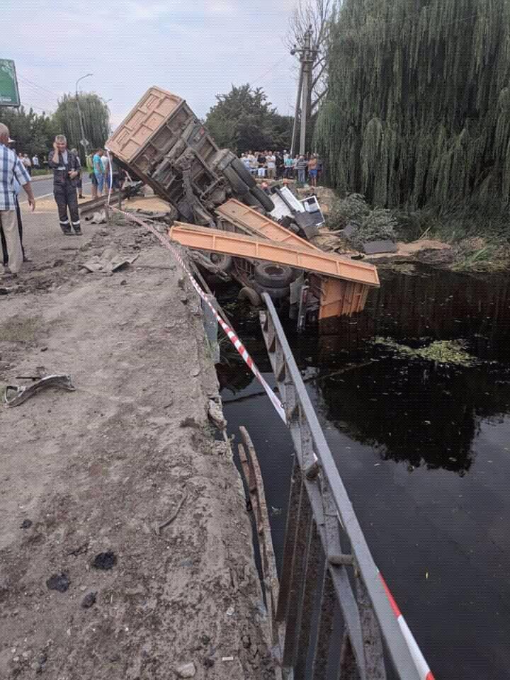 "Авария возле моста на Заслучье в Староконстантинове. По предварительной информации: у фуры выстрелило колесо. Одного человека извлекли, водителя достают", – отметил он.