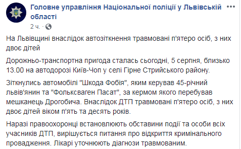 На трассе "Киев-Чоп" в Львовской области произошло ДТП. В результате столкновения легковых авто пострадали пятеро человек, из них 2 детей.