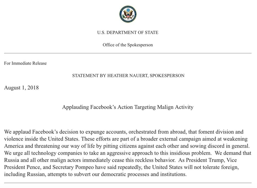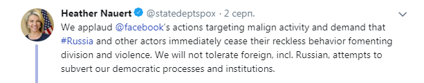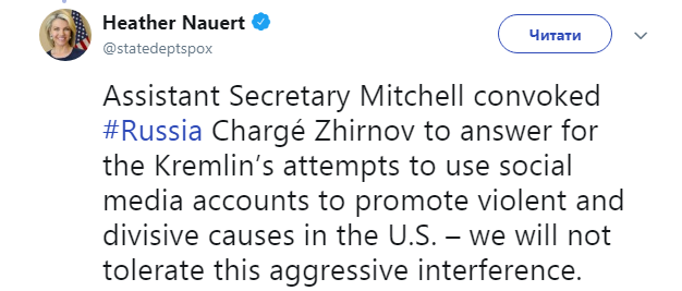 "Помощник государственного секретаря Митчелл вызвал поверенного по делам России Жирнова, чтобы он дал ответ относительно попыток Кремля использовать учетные записи в соцсетях для пропаганды насилия и раздора в США – мы не будем терпеть это агрессивное вмешательство", - написала она.