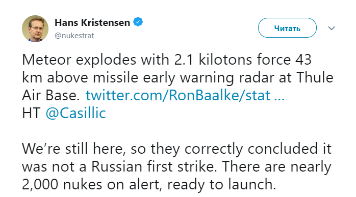 Директор Проекта ядерной информации Федерации американских ученых Ханс Кристенсен, который и сообщил об этом событии, пошутил, что "Мы все еще здесь, так что это была явно не атака русских. Там около 2000 боеголовок, готовых к запуску".