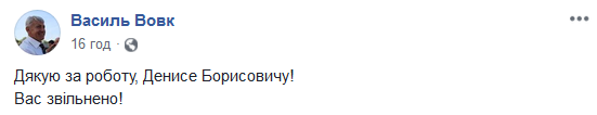 "Спасибо за работу, Денис Борисович! Вы уволены", - написал Василий Вовк.