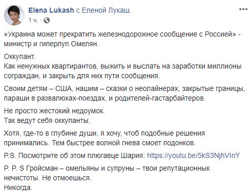 Юрист, экс-депутат Елена Лукаш возмущена: "Украина может прекратить железнодорожное сообщение с Россией" - министр и гиперлуп Омелян.