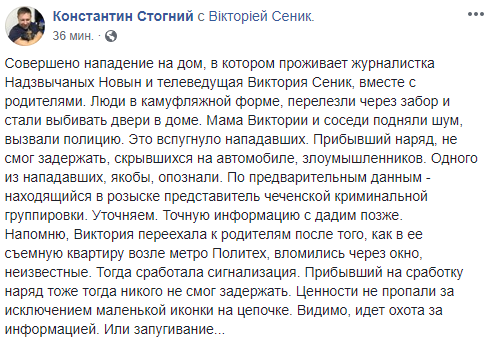"Люди в камуфляжной форме, перелезли через забор и стали выбивать двери в доме. Мама Виктории и соседи подняли шум, вызвали полицию. Это вспугнуло нападавших. Прибывший наряд, не смог задержать, скрывшихся на автомобиле, злоумышленников. Одного из нападавших, якобы, опознали. По предварительным данным - находящийся в розыске представитель чеченской криминальной группировки. Уточняем. Точную информацию с дадим позже", - написал он.