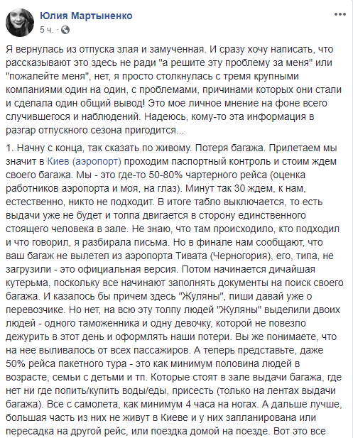 "А теперь представьте, даже 50% рейса пакетного тура - это как минимум половина людей в возрасте, семьи с детьми и тп. Которые стоят в зале выдачи багажа, где нет ни где попить/купить воды/еды, присесть (только на лентах выдачи багажа). Все с самолета, как минимум 4 часа на ногах. А дальше лучше, большая часть из них не живут в Киеве и у них запланирована или пересадка на другой рейс, или поездка домой на поезде. Вот это все оформление заняло у всех где-то часа 4," - уточнила она.