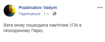 "Вата опять повредила памятник УПА в Молодежном Парке", - написал Поздняков на своей странице в Facebook в понедельник, 6 августа, вечером.
