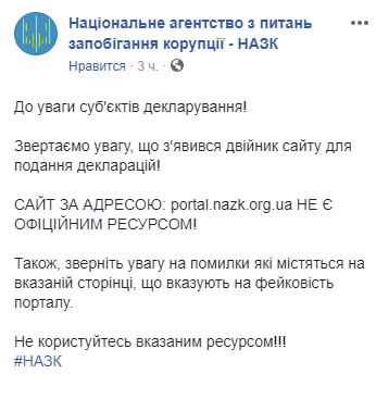 "Вниманию субъектов декларирования! Обращаем внимание, что появился двойник сайта для подачи деклараций! САЙТ ПО АДРЕСУ: portal.nazk.org.ua НЕ ЯВЛЯЕТСЯ ОФИЦИАЛЬНЫМ РЕСУРСОМ!", - говорится в сообщении.