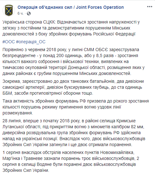 "28 июля, впервые с начала 2018 года, в районе поселка Крымское Луганской области, под прикрытием огня из минометов калибром 82 мм, диверсионная разведывательная группа вооруженных формирований РФ совершила нападение на украинские позиции. В результате, двое военнослужащих Вооруженных Сил Украины погибли и еще двое получили ранения", - говорится в сообщении.