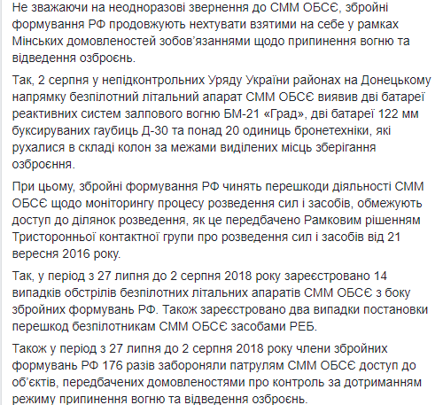 Сообщается, что также 2 августа в подконтрольных боевикам районах на Донецком направлении беспилотный летательный аппарат СММ ОБСЕ обнаружил две батареи реактивных систем залпового огня БМ-21 "Град", две батареи 122 мм буксируемых гаубиц Д-30 и более 20 единиц бронетехники, которые двигались в составе колонн вне выделенных мест хранения вооружения.