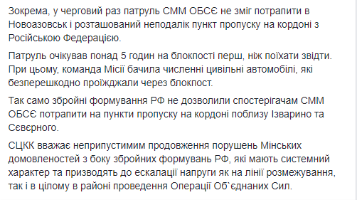 Кроме того отмечается, что боевики препятствуют деятельности мониторинговой миссии.